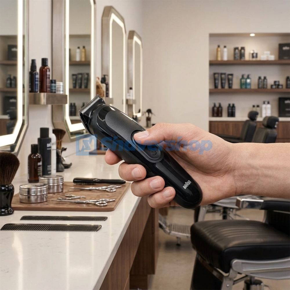 Braun MGK3410 All-in-One Style Kit A versatile 6-in-1 male grooming trimmer for precise beard styling and effortless hair clipping.