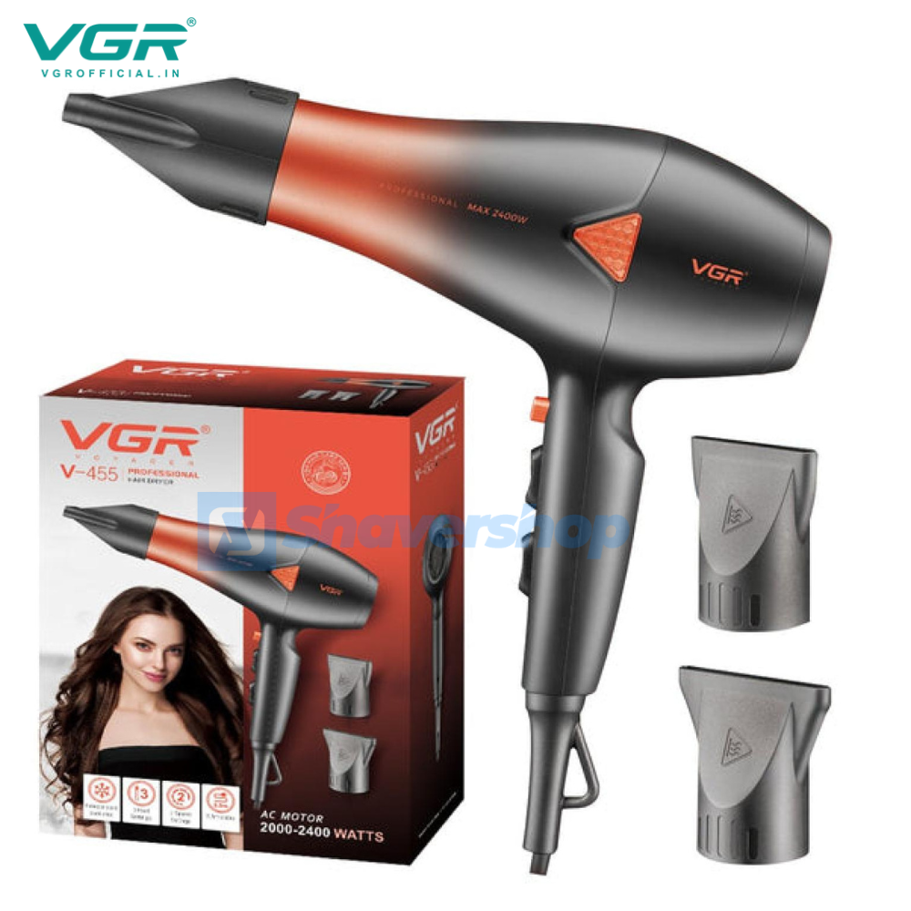 ভিজিআর ভি-৪৫৫ হলো প্রফেশনাল স্যালন সিরিজের একটি হেয়ার ড্রায়ার। এটিকে উচ্চ ক্ষমতাসম্পন্ন এবং দ্রুত চুল শুকানোর জন্য বিশেষভাবে ডিজাইন করা হয়েছে। এটি বাসায় ব্যক্তিগত ব্যবহার অথবা সেলুনে প্রফেশনাল ব্যবহারের জন্য একটি আদর্শ, শক্তিশালী এবং নির্ভরযোগ্য হেয়ার ড্রায়ার।